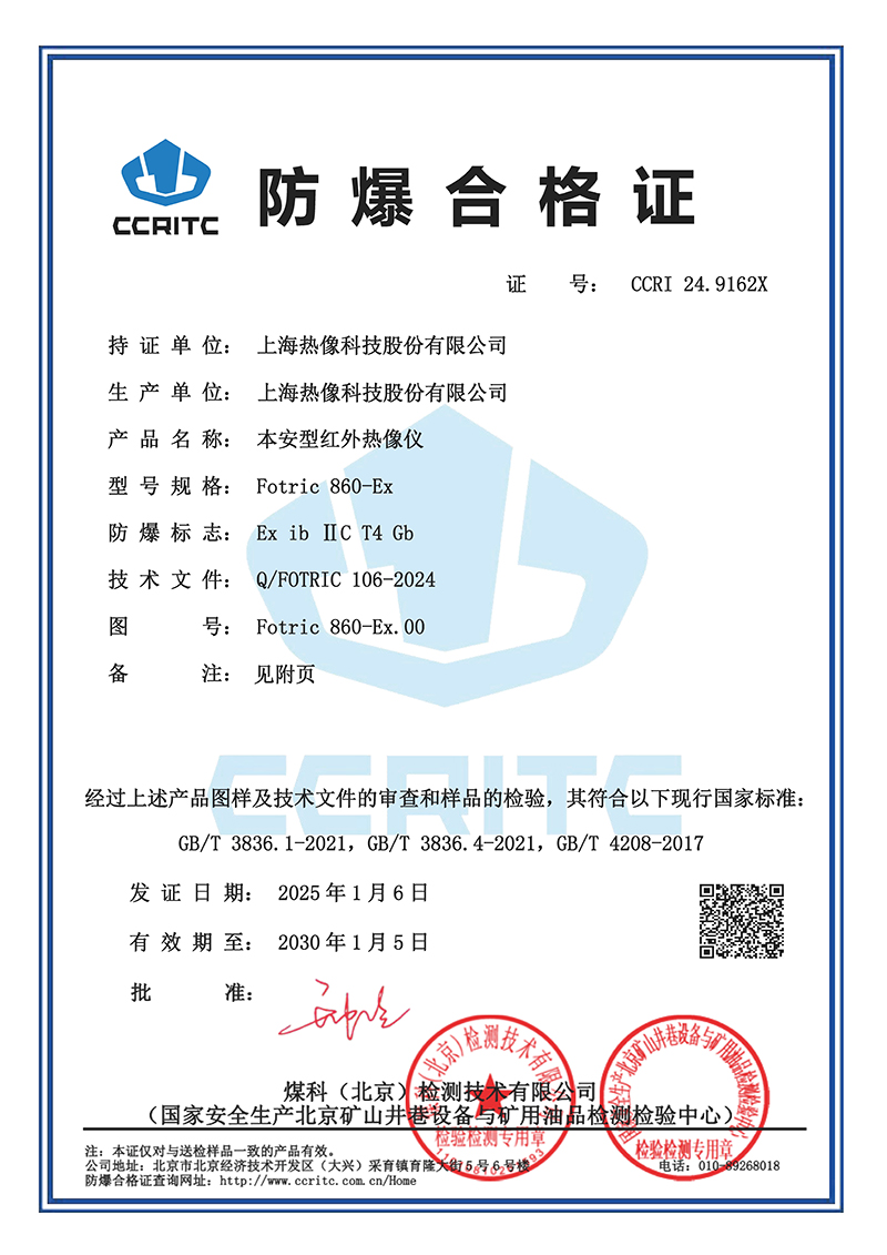 FOTRIC 860-Ex系列防爆手持热像仪,属于本安型防爆,防爆等级“高”;无须动火证,即可进入除煤矿、井下之外的所有爆炸性气体环境中的1区、2区执行巡检任务。 | |